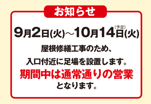 屋根修繕工事のお知らせ 9/2(火)~10/14(火)(予定...